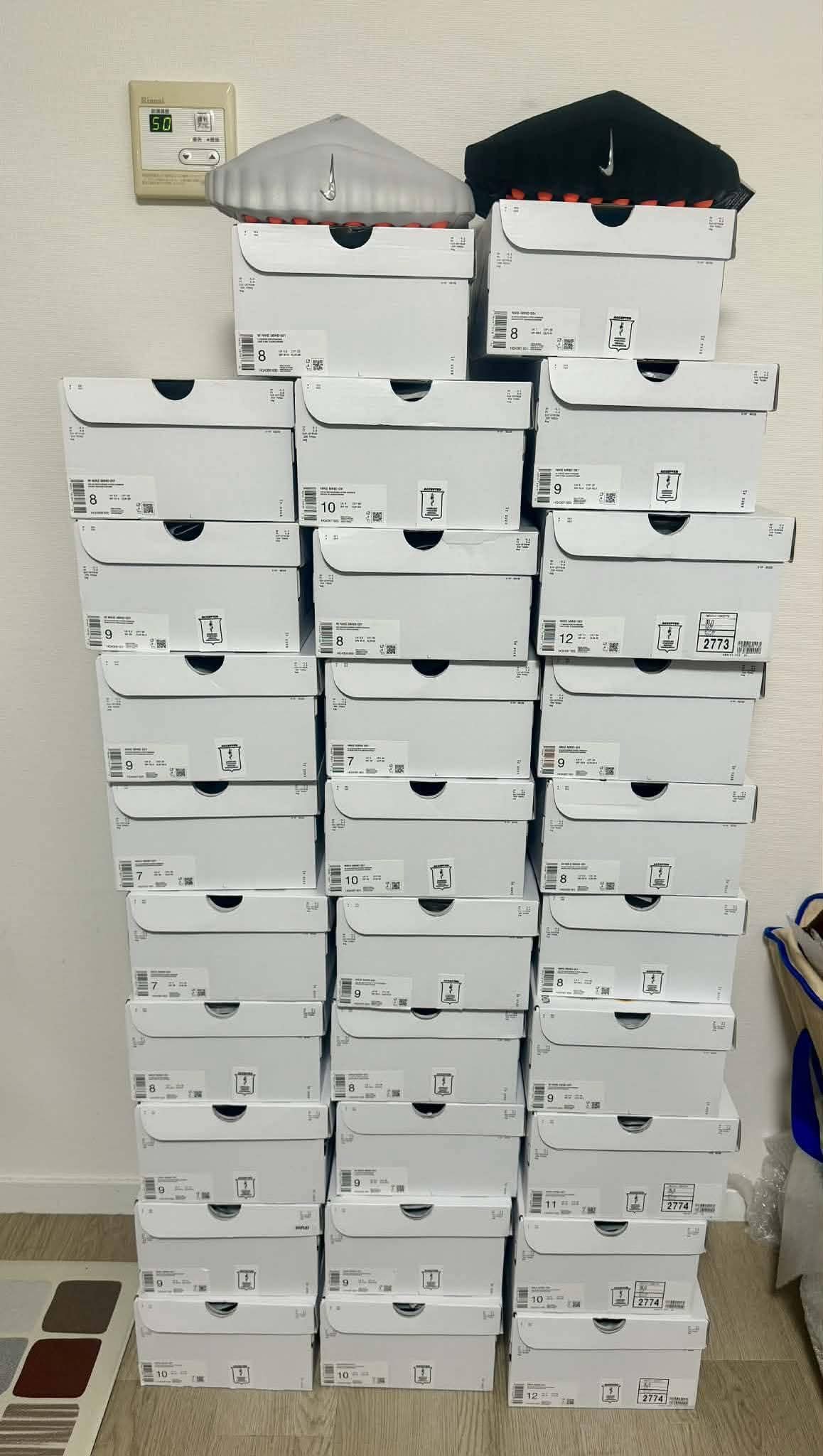 A mix of different brands and sizes in a pallet of 100 pairs sells for $2,500 (each pair costs $25) wholesale price, retailer’s dream prices.
